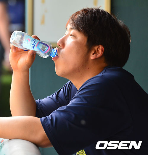 23일 오후 서울 잠실구장에서 열린 2013 한국야쿠르트 세븐프로야구 두산 베어스와 넥센 히어로즈의 경기 전 두산 김현수가 훈련을 마친 후 물을 마시고 있다.