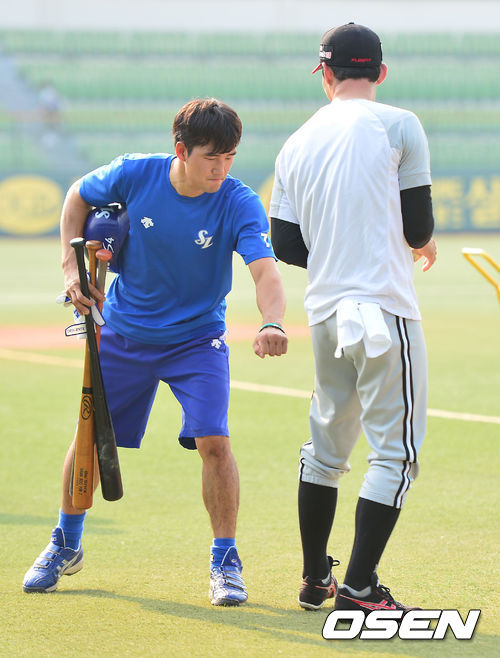 23일 오후 대구구장에서 열리는 '2013 한국야쿠르트 세븐 프로야구' 삼성 라이온즈 대 LG 트윈스와의 경기를 앞두고 삼성 김상수와 LG 손주인이 만나 대화를 나누고 있다.