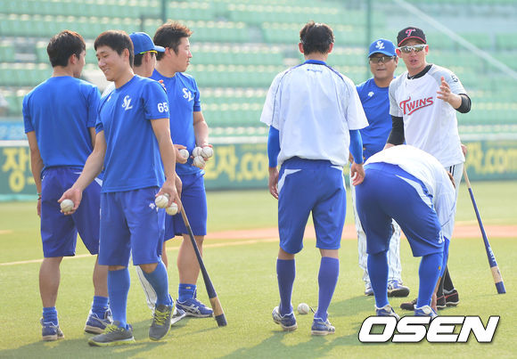 23일 오후 대구구장에서 열리는 '2013 한국야쿠르트 세븐 프로야구' 삼성 라이온즈 대 LG 트윈스와의 경기를 앞두고 LG 손주인이 삼성 선수들과 대화를 나누고 있다.