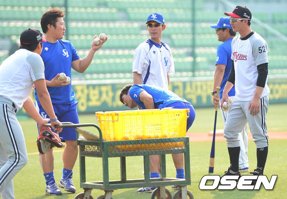 23일 오후 대구구장에서 열리는 '2013 한국야쿠르트 세븐 프로야구' 삼성 라이온즈 대 LG 트윈스와의 경기를 앞두고 LG 손주인이 삼성 최형우를 비롯한 선수들과 만나 대화를 나누고 있다.