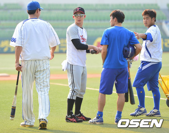 23일 오후 대구구장에서 열리는 '2013 한국야쿠르트 세븐 프로야구' 삼성 라이온즈 대 LG 트윈스와의 경기를 앞두고 LG 손주인이 삼성 선수들과 만나 대화를 나누고 있다.