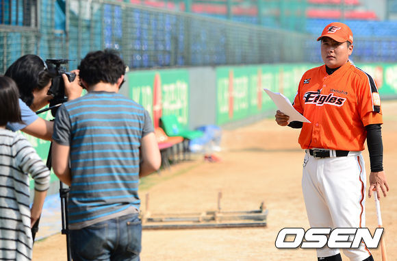 23일 오후 광주 무등야구장에서 열린 '2013 한국야쿠르트 세븐 프로야구' KIA 타이거즈와 한화 이글스의 경기, 경기에 앞서 한화 김태균이 방송 인터뷰 전 질문지를 확인하고 있다.