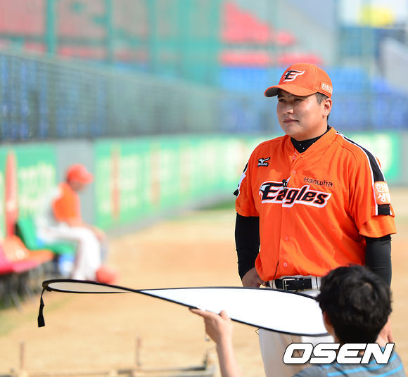 23일 오후 광주 무등야구장에서 열린 '2013 한국야쿠르트 세븐 프로야구' KIA 타이거즈와 한화 이글스의 경기, 경기에 앞서 한화 김태균이 방송 인터뷰를 하고 있다.