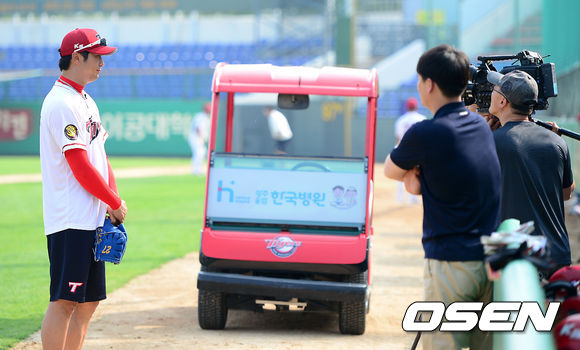 23일 오후 광주 무등야구장에서 열린 '2013 한국야쿠르트 세븐 프로야구' KIA 타이거즈와 한화 이글스의 경기, 경기에 앞서 KIA 신승현이 방송 인터뷰를 하고 있다.