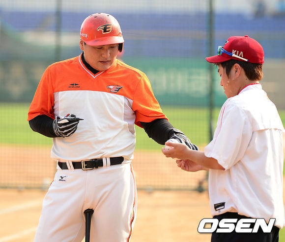 23일 오후 광주 무등야구장에서 열린 '2013 한국야쿠르트 세븐 프로야구' KIA 타이거즈와 한화 이글스의 경기, 경기에 앞서 한화 김태균이 KIA 관계자에게 사인볼을 건네고 있다.