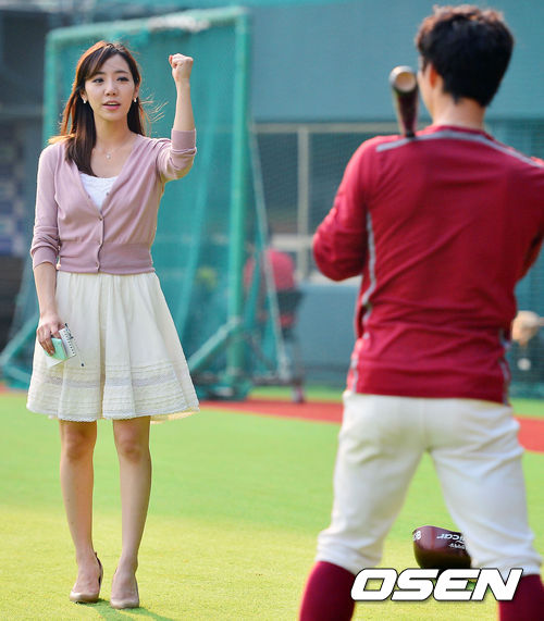 23일 오후 서울 잠실구장에서 열린 2013 한국야쿠르트 세븐프로야구 두산 베어스와 넥센 히어로즈의 경기 전 XTM 정순주 아나운서가 타격연습을 하던 정수성에게 파이팅을 외치고 있다.