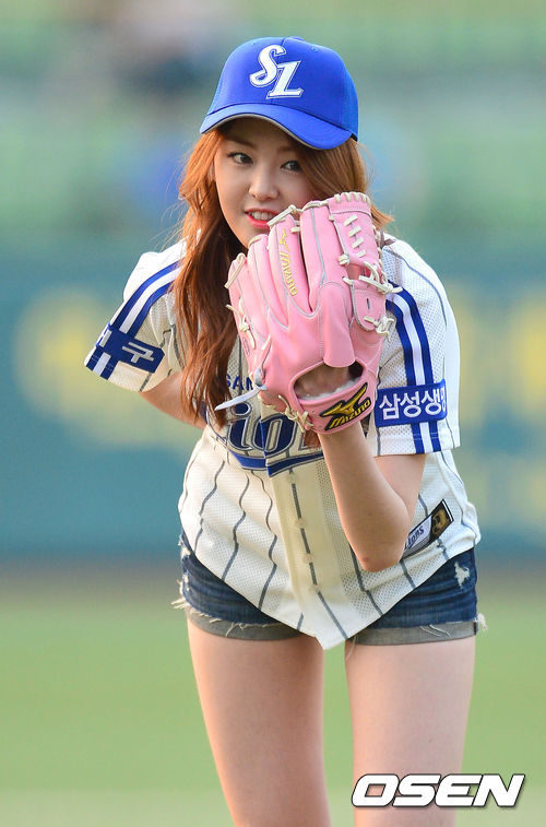 23일 오후 대구구장에서 '2013 한국야쿠르트 세븐 프로야구' 삼성 라이온즈 대 LG 트윈스와의 경기가 열렸다. 시구자로 나선 2011 미스코리아 선 출신인 방송인 김이슬이 사인을 내는 제스처를 취하고 있다.