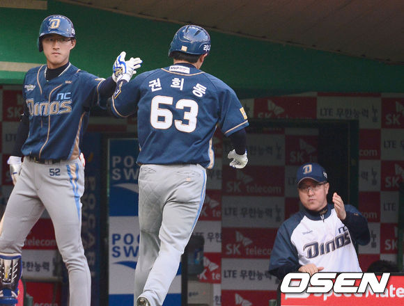 23일 오후 문학 야구장에서 열린 '2013 한국야쿠르트 세븐 프로야구' SK 와이번스와 NC 다이노스 경기,2회초 1사 권희동 중월솔로 홈런을 날리고 홈인 김경문 감독의 환영을 받고 있다.