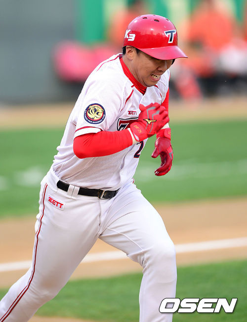 23일 오후 광주 무등야구장에서 열린 '2013 한국야쿠르트 세븐 프로야구' KIA 타이거즈와 한화 이글스의 경기, 1회말 2사에서 KIA 이범호가 좌전 2루타를 치고 그라운드를 달리고 있다.