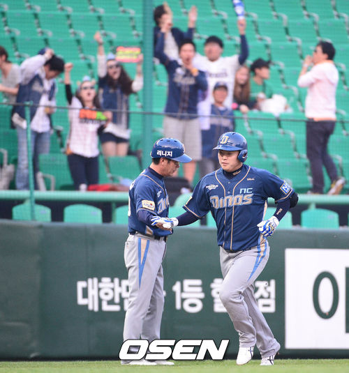 23일 오후 문학 야구장에서 열린 '2013 한국야쿠르트 세븐 프로야구' SK 와이번스와 NC 다이노스 경기,2회초 1사 권희동 중월 동점 홈런을 날리고 홈인하고 있다.