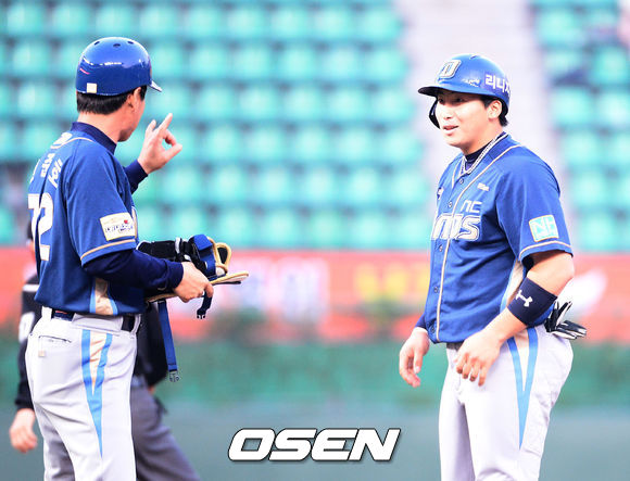 23일 오후 문학 야구장에서 열린 '2013 한국야쿠르트 세븐 프로야구' SK 와이번스와 NC 다이노스 경기,2회초 2사 1,2루 나성범 1타점 적시타를 날리고 2루에서 전준호 코치의 환영을 받고 있다.