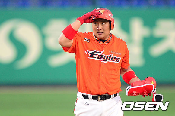 23일 오후 광주 무등야구장에서 열린 '2013 한국야쿠르트 세븐 프로야구' KIA 타이거즈와 한화 이글스의 경기, 3회초 1사 1루에서 한화 김태균이 좌전 적시타를 치고 타임을 외치고 있다.