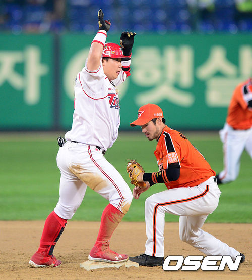23일 오후 광주 무등야구장에서 열린 '2013 한국야쿠르트 세븐 프로야구' KIA 타이거즈와 한화 이글스의 경기, 3회말 1사 3루에서 KIA 나지완이 좌전 적시 2루타를 치고 2루에서 세이프되고 있다.