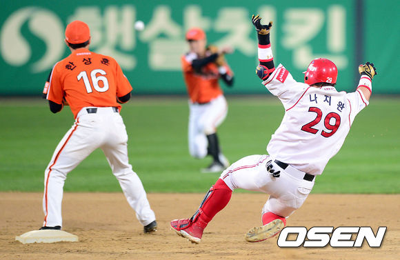 23일 오후 광주 무등야구장에서 열린 '2013 한국야쿠르트 세븐 프로야구' KIA 타이거즈와 한화 이글스의 경기, 3회말 1사 3루에서 KIA 나지완이 좌전 적시타를 치고 2루로 슬라이딩을 하고 있다.