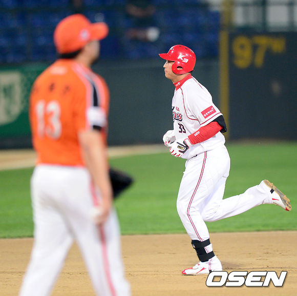 23일 오후 광주 무등야구장에서 열린 '2013 한국야쿠르트 세븐 프로야구' KIA 타이거즈와 한화 이글스의 경기, 4회말 1사 1루에서 KIA 김주형이 좌월 투런 홈런을 치고 그라운드를 돌고 있다.