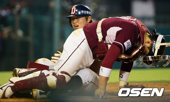 23일 오후 서울 잠실구장에서 열린 2013 한국야쿠르트 세븐프로야구 두산 베어스와 넥센 히어로즈의 경기 5회말 2사 주자 1,2루 두산 김현수의 우익수 앞 1루타때 2루 주자 정수빈이 홈으로 쇄도 했으나 넥센 허도환 포수에게 태그아웃 당하자 아쉬워하고 있다.