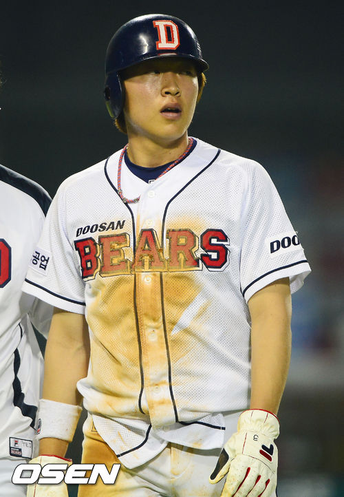 23일 오후 서울 잠실구장에서 열린 2013 한국야쿠르트 세븐프로야구 두산 베어스와 넥센 히어로즈의 경기 5회말 2사 주자 1,2루 두산 김현수의 우익수 앞 1루타때 2루 주자 정수빈이 홈으로 쇄도 했으나 넥센 허도환 포수에게 태그아웃 당했다. 정수빈이 아쉬운 표정을 덕아웃으로 들어오고 있다.