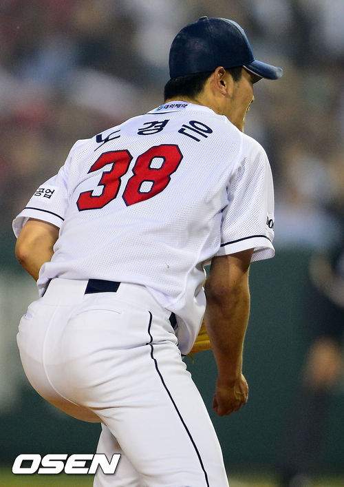 23일 오후 서울 잠실구장에서 열린 2013 한국야쿠르트 세븐프로야구 두산 베어스와 넥센 히어로즈의 경기 5회초를 마치고 두산 선발 노경은이 주먹을 쥐며 기뻐하고 있다.
