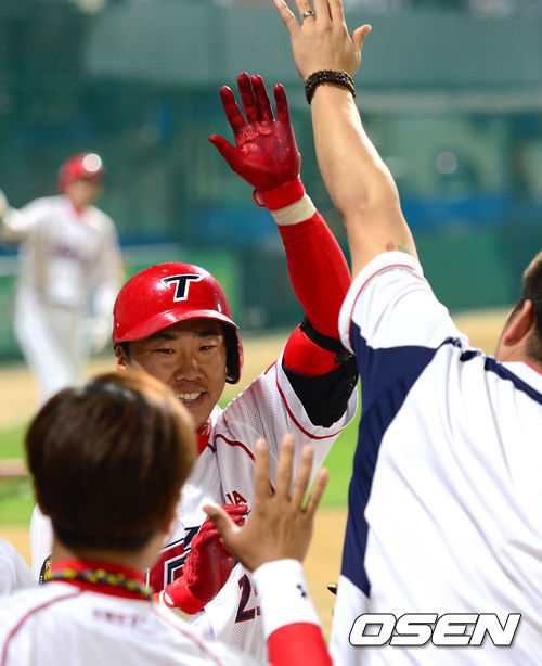 23일 오후 광주 무등야구장에서 열린 '2013 한국야쿠르트 세븐 프로야구' KIA 타이거즈와 한화 이글스의 경기, 5회말 무사에서 KIA 이범호가 좌월 솔로포를 치고 덕아웃에서 동료들의 축하를 받고 있다.