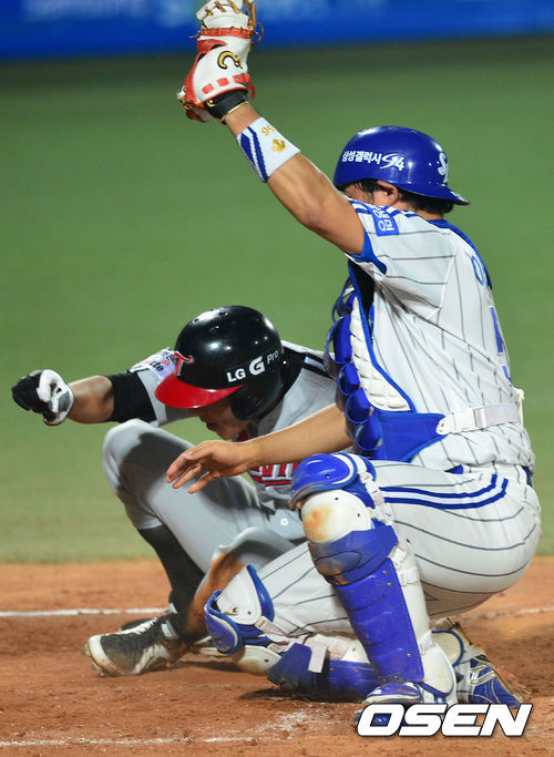 권용관은 23일 대구구장에서 열린 삼성 라이온즈와의 원정 경기에서 1-1로 맞선 6회 정성훈 타석 때 홈베이스를 파고 들었다.