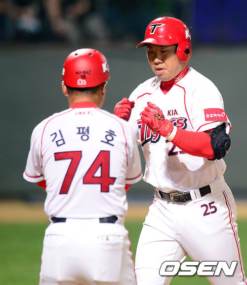 23일 오후 광주 무등야구장에서 열린 '2013 한국야쿠르트 세븐 프로야구' KIA 타이거즈와 한화 이글스의 경기, 5회말 무사에서 KIA 이범호가 좌월 솔로포를 치고 홈에서 김평호 코치와 하이파이브를 하고 있다.
