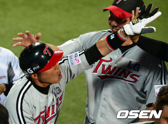 23일 오후 대구구장에서 '2013 한국야쿠르트 세븐 프로야구' 삼성 라이온즈 대 LG 트윈스와의 경기가 열렸다. 6회초 LG 공격 2사 1, 3루 상황 4번 정성훈 타석, 3루주자 권용관이 득점에 성공한 뒤 더그아웃 동료들과 기쁨을 나누고 있다.