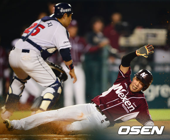 23일 오후 서울 잠실구장에서 열린 2013 한국야쿠르트 세븐프로야구 두산 베어스와 넥센 히어로즈의 경기 8회초 2사 주자 1,2루 넥센 박동원이 좌중간 1타점 동점 적시타때 2루 주자 유재신이 홈으로 몸을 던지며 세이프되고 있다.