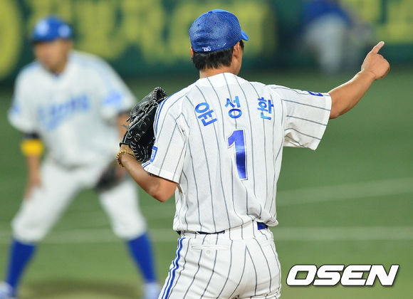 23일 오후 대구구장에서 '2013 한국야쿠르트 세븐 프로야구' 삼성 라이온즈 대 LG 트윈스와의 경기가 열렸다. 8회초 LG 공격 1사 주자없는 상황, 삼성 선발 윤성환이 2번 오지환의 땅볼 타구를 멋지게 처리한 유격수 김상수를 향해 인사하고 있다.