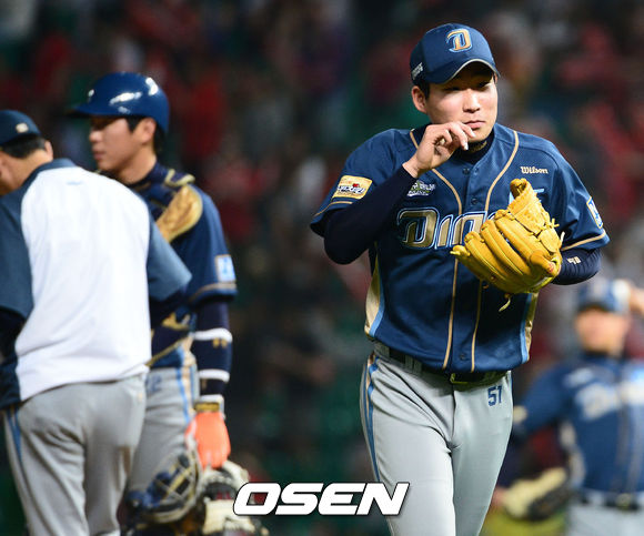 23일 오후 문학 야구장에서 열린 '2013 한국야쿠르트 세븐 프로야구' SK 와이번스와 NC 다이노스 경기,7회말 1사 1루 NC 선발 이재학이 임창민에게 마운드를 넘겨주며 내려오고 있다.