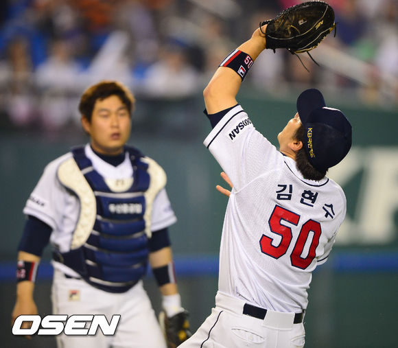 23일 오후 서울 잠실구장에서 열린 2013 한국야쿠르트 세븐프로야구 두산 베어스와 넥센 히어로즈의 경기 8회초 1사 주자 1,2루 넥센 오윤의 타구를 두산 1루수 김현수가 잡아내고 있다.