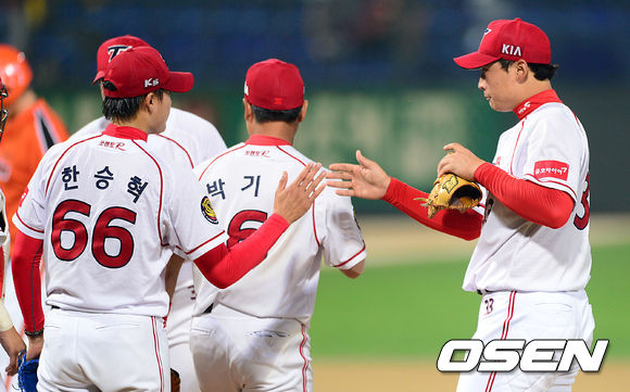 경기 종료 후 KIA 김주형이 동료들과 승리의 기쁨을 나누고 있다. /sunday@osen.co.kr