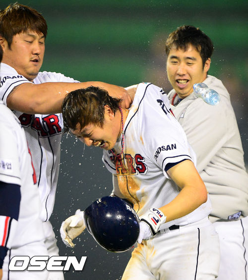 연장 11회말 1사 주자 만루 두산 정수빈이 끝내기 안타를 날린 후 끝내기 축하를 받고 있다. / rumi@osen.co.kr