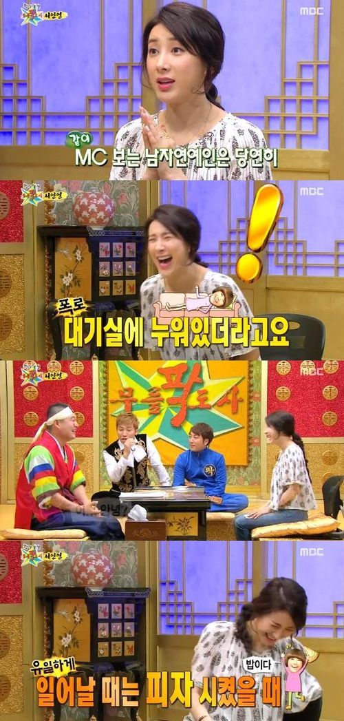 이어 유세윤은 “항상 누워 있고 유일하게 일어날 때는 피자 시켰을 때다”라며 “대본 리딩 할 때도 누워서 한다. 나는 옆에서 서 있었다”고 거침없이 밝혔다. 이를 듣던 강호동은 “그 때는 바쁠 때니까 그런 거 아니냐”며 수습에 나섰다.