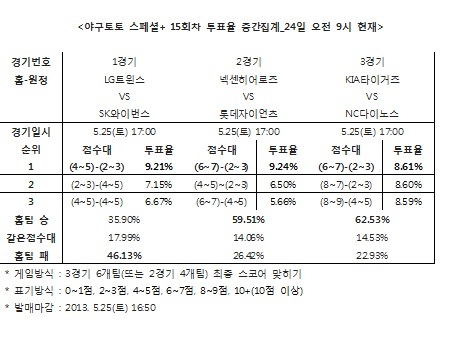 국민체육진흥공단(www.kspo.or.kr)이 발행하는 체육진흥투표권 수탁사업자인 스포츠토토의 공식 온라인 발매 사이트 베트맨(www.betman.co.kr)이 25일(토)에 열리는 한국프로야구(KBO) 3경기를 대상으로 한 야구토토 스페셜+ 15회차 투표율을 중간 집계한 결과, 참가자의 59.51%는 넥센-롯데(2경기)전에서 홈팀 넥센이 롯데에 우세 할 것으로 내다봤다.