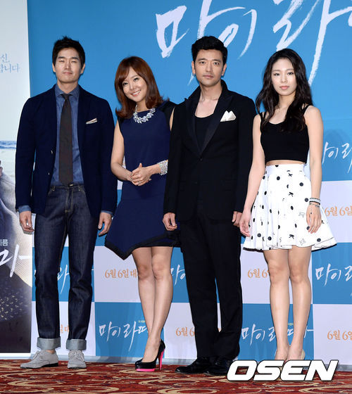 24일 오후 서울 자양동 롯데시네마 건대입구점에서 진행된 '마이 라띠마' 언론배급시사회에서 유지태, 소유진, 배수빈, 박지수가 포토타임을 갖고 있다.
