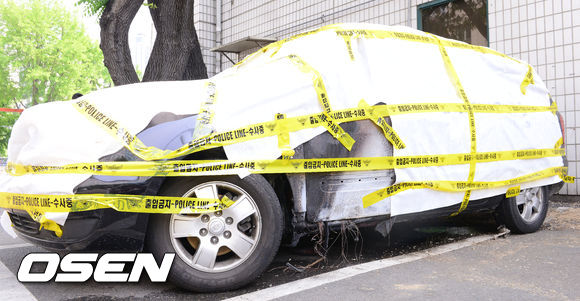 서울 용산구 원효로 사고지역 인근 서울용산경찰서 방범순찰대 앞 주차장에 손호영 사고 차량이 주차되어 있다. / soul1014@osen.co.kr