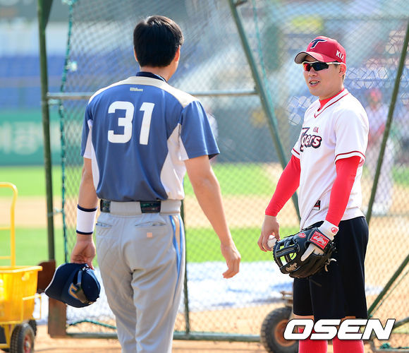 24일 오후 광주 무등야구장에서 열린 '2013 한국야쿠르트 세븐 프로야구' KIA 타이거즈와 NC 다이노스의 경기, 경기에 앞서 KIA 안치홍과 NC 이현곤이 인사를 나누고 있다.