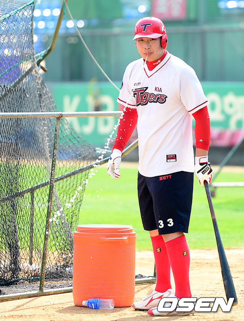 24일 오후 광주 무등야구장에서 열린 '2013 한국야쿠르트 세븐 프로야구' KIA 타이거즈와 NC 다이노스의 경기, 경기에 앞서 KIA 김주형이 타격 훈련 중 마신 물을 뿌리고 있다.