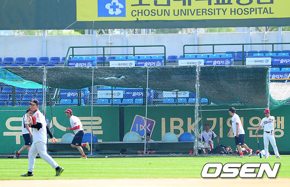 24일 오후 광주 무등야구장에서 열린 '2013 한국야쿠르트 세븐 프로야구' KIA 타이거즈와 NC 다이노스의 경기, 경기에 앞서 KIA 선수들이 그늘막 훈련장에서 훈련을 하고 있다.