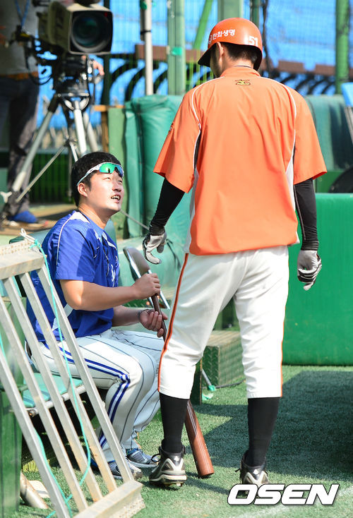 24일 오후 대전구장에서 열리는 '2013 한국야쿠르트 세븐 프로야구' 한화 이글스 대 삼성 라이온즈의 경기를 앞두고 삼성 오승환과 한화 김경언이 인사를 나누고 있다.