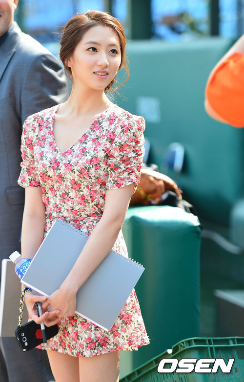 24일 오후 대전구장에서 열리는 '2013 한국야쿠르트 세븐 프로야구' 한화 이글스 대 삼성 라이온즈의 경기를 앞두고 XTM 조유영 아나운서가 한화 선수들과 인사를 나누고 있다.