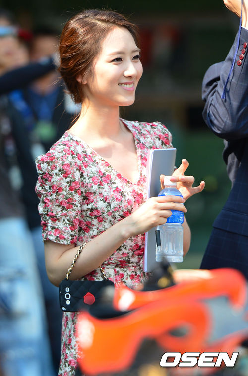 24일 오후 대전구장에서 열리는 '2013 한국야쿠르트 세븐 프로야구' 한화 이글스 대 삼성 라이온즈의 경기를 앞두고 XTM 조유영 아나운서가 한화 선수들과 인사를 나누고 있다.
