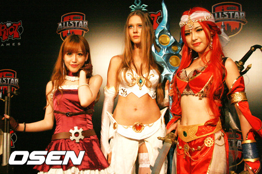 '웨이샤오' 가오 쉐청이 속한 중국과 '더블리프트' 피터 펭이 속한 미국 팀의 경기가 열리기전 포토월에서 모델들이 LOL 인기 캐릭터인 케이틀린, 잔나, 카탈리나 코스튬 플레이 포즈를 취하고 있다.