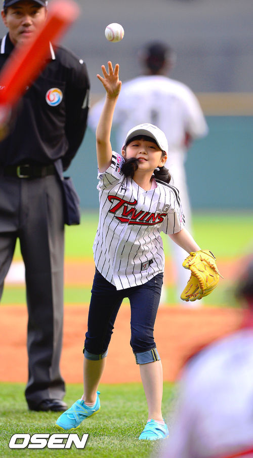 24일 오후 서울 잠실구장에서 열린 '2013 한국야쿠르트 세븐 프로야구' LG 트윈스와 SK 와이번스의 경기, 경기에 앞서 아역배우 전민서가 시구를 하고 있다