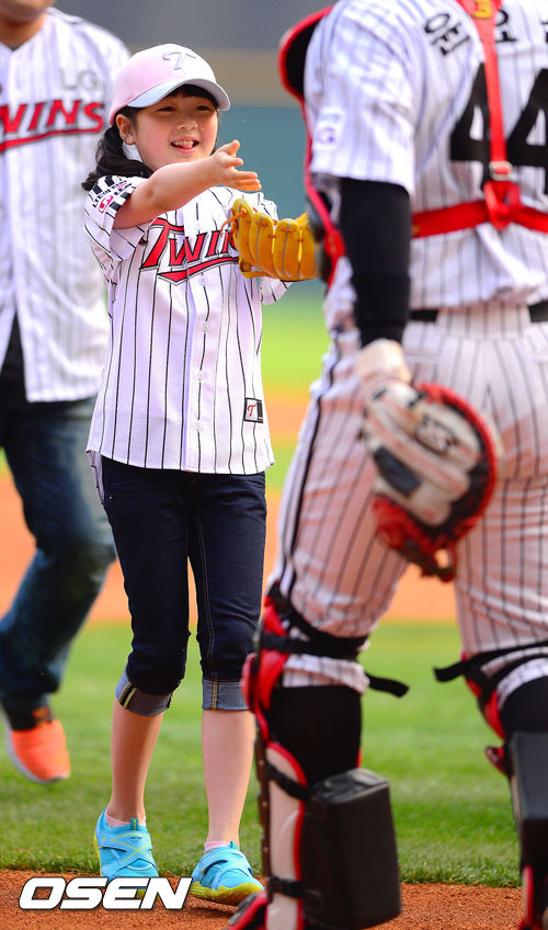 24일 오후 서울 잠실구장에서 열린 '2013 한국야쿠르트 세븐 프로야구' LG 트윈스와 SK 와이번스의 경기, 경기에 앞서 아역배우 전민서가 시구를 마친후 LG 윤요섭 포수에게 공을 건네받고 있다