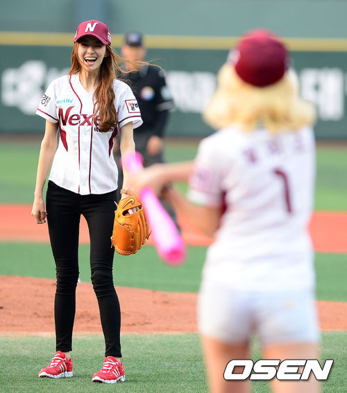 24일 오후 서울 목동야구장에서 열린 '2013 한국야쿠르트 세븐 프로야구' 넥센 히어로즈와 롯데 자이언츠의 경기, 경기에 앞서 헬로비너스 나라가 시구를, 앨리스가 시타를 하며 즐거워하고 있다.