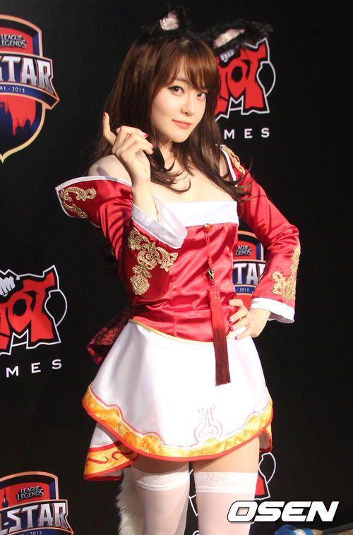 리그 오브 레전드 열혈 마니아로 알려진 인기 성우 서유리가 '웨이샤오' 가오 쉐청이 속한 중국과 '더블리프트' 피터 펭이 속한 미국 팀의 경기가 열리기전 포토월에서 아리로 코스튬 포즈를 취하고 있다.