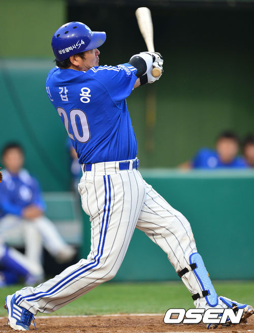 24일 오후 대전구장에서 '2013 한국야쿠르트 세븐 프로야구' 한화 이글스 대 삼성 라이온즈의 경기가 열렸다. 3회초 삼성 공격 선두타자로 나선 8번 진갑용이 선제 좌월 솔로포를 날리고 있다.