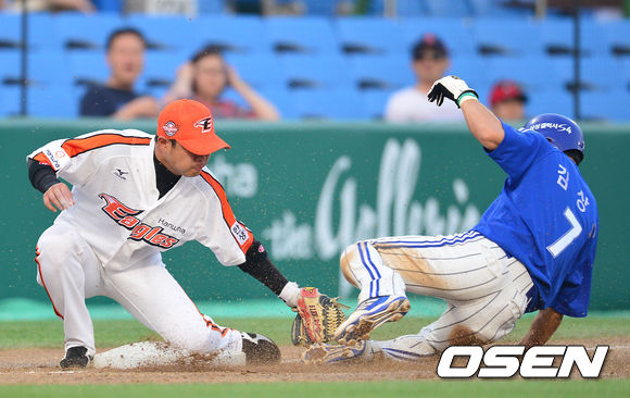 24일 오후 대전구장에서 '2013 한국야쿠르트 세븐 프로야구' 한화 이글스 대 삼성 라이온즈의 경기가 열렸다. 3회초 삼성 공격 1사 2루 상황, 1번 배영섭의 헛스윙 삼진 때 3루 도루를 시도한 주자 김상수가 한화 3루수 이학준의 태그에 걸려 아웃되고 있다.