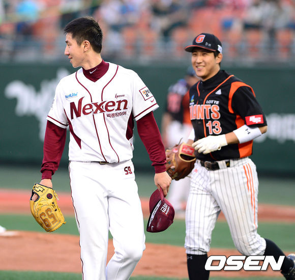 24일 오후 서울 목동야구장에서 열린 '2013 한국야쿠르트 세븐 프로야구' 넥센 히어로즈와 롯데 자이언츠의 경기, 2회말 수비를 마친 넥센 강윤구가 공수교대를 하며 롯데 황재균과 이야기를 나누고 있다.